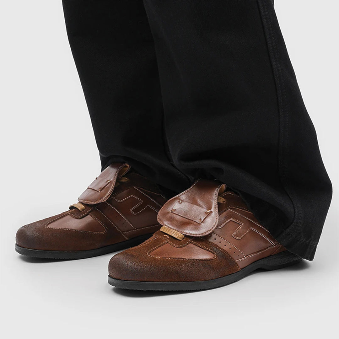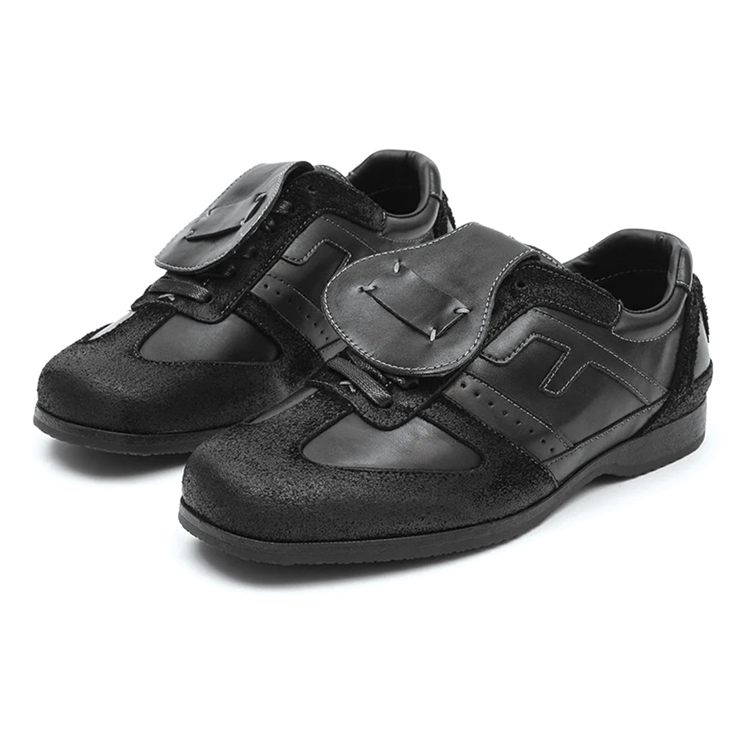 A low-profile leather sneaker with a refined strap overlay and subtle paneling that brings structure to an everyday silhouette. Designed to move between casual and tailored looks without losing its character.