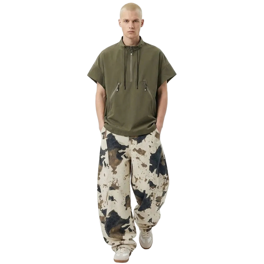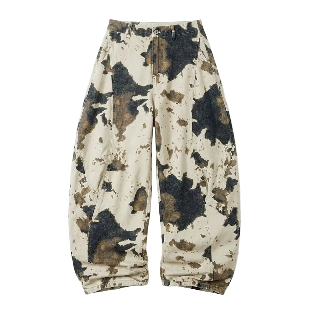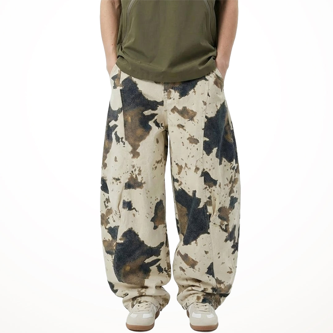 A disrupted pattern blurs the line between organic animal print and military aesthetics across the surface of these trousers. The heavy cotton fabric holds the exaggerated volume of the leg, creating a silhouette that stacks deliberately over footwear.