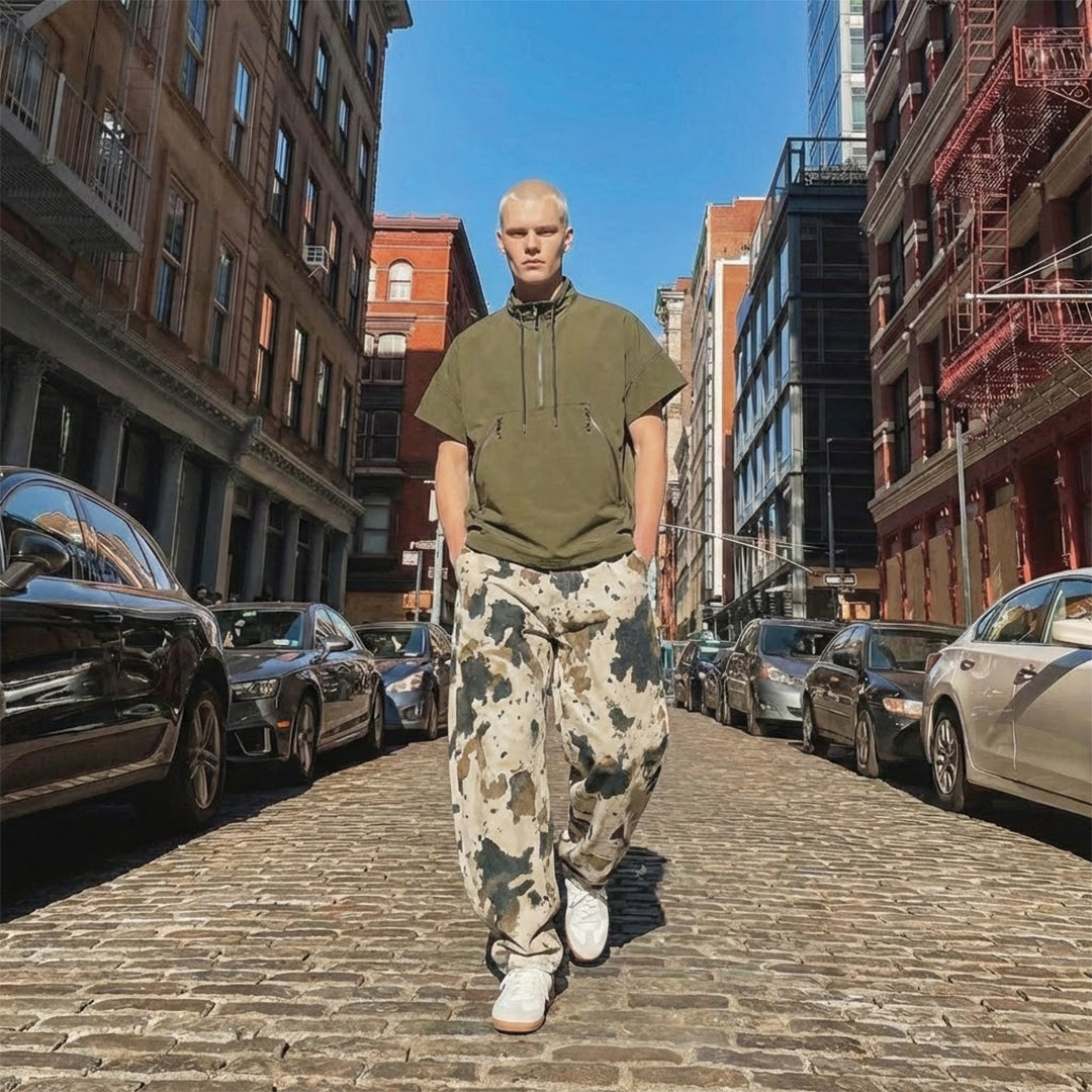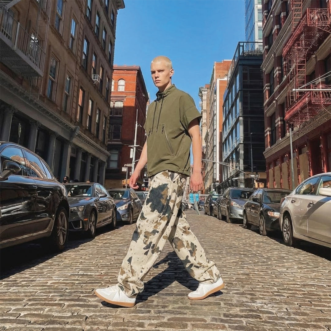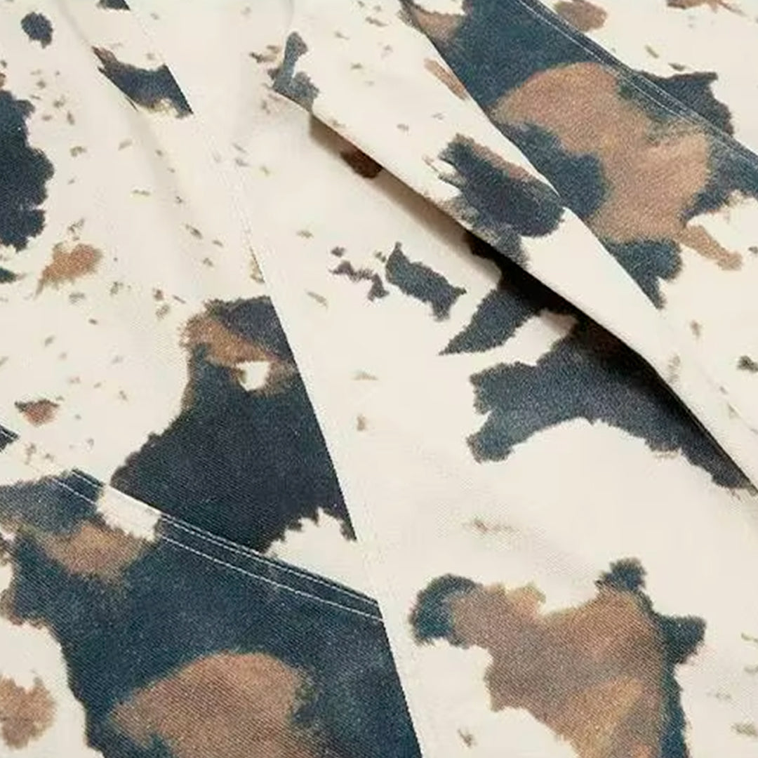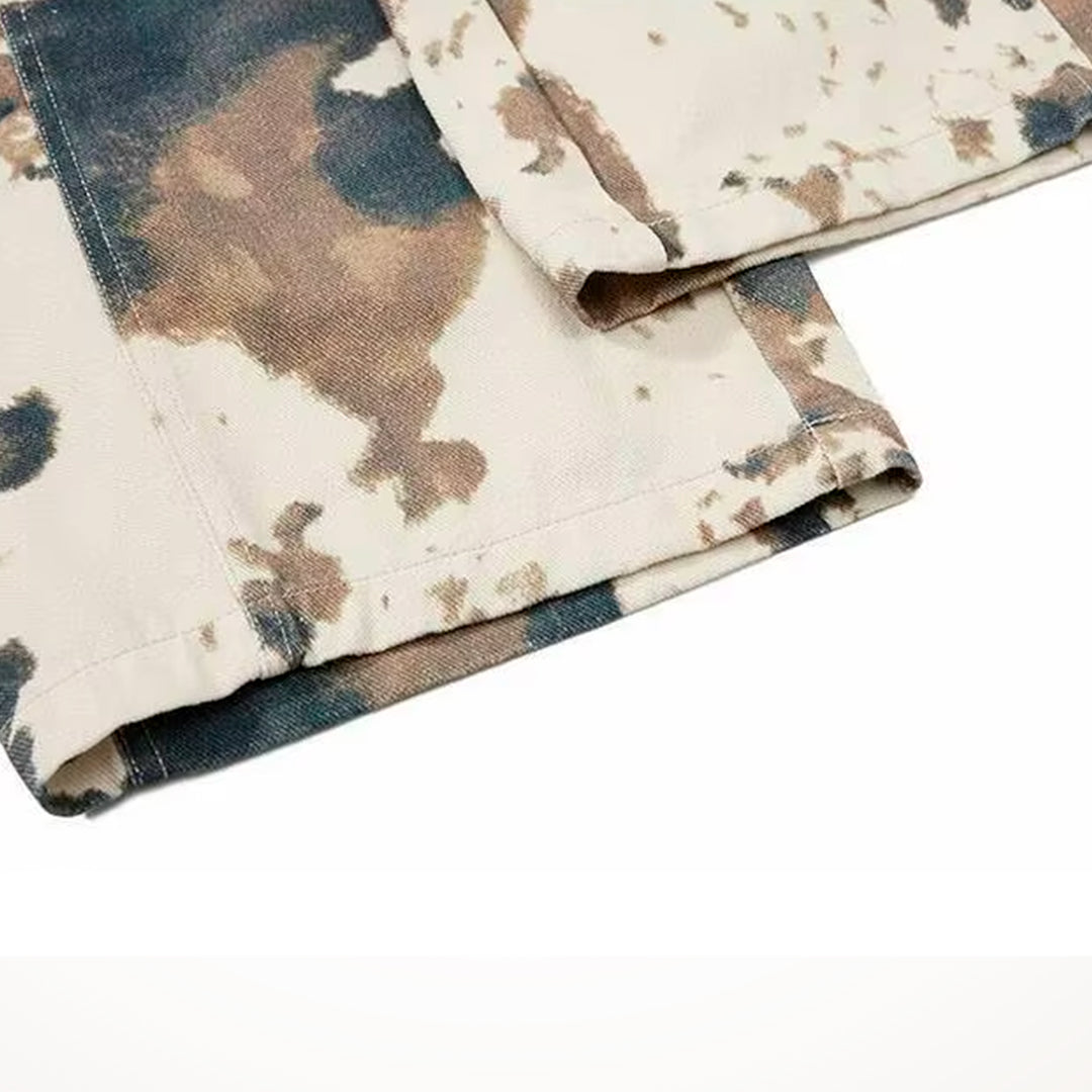 A disrupted pattern blurs the line between organic animal print and military aesthetics across the surface of these trousers. The heavy cotton fabric holds the exaggerated volume of the leg, creating a silhouette that stacks deliberately over footwear.