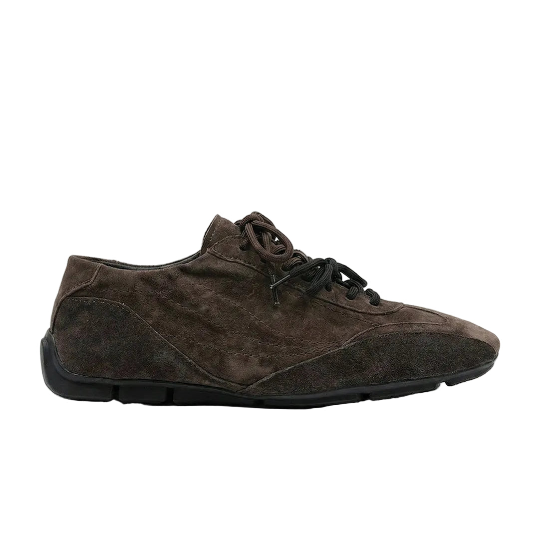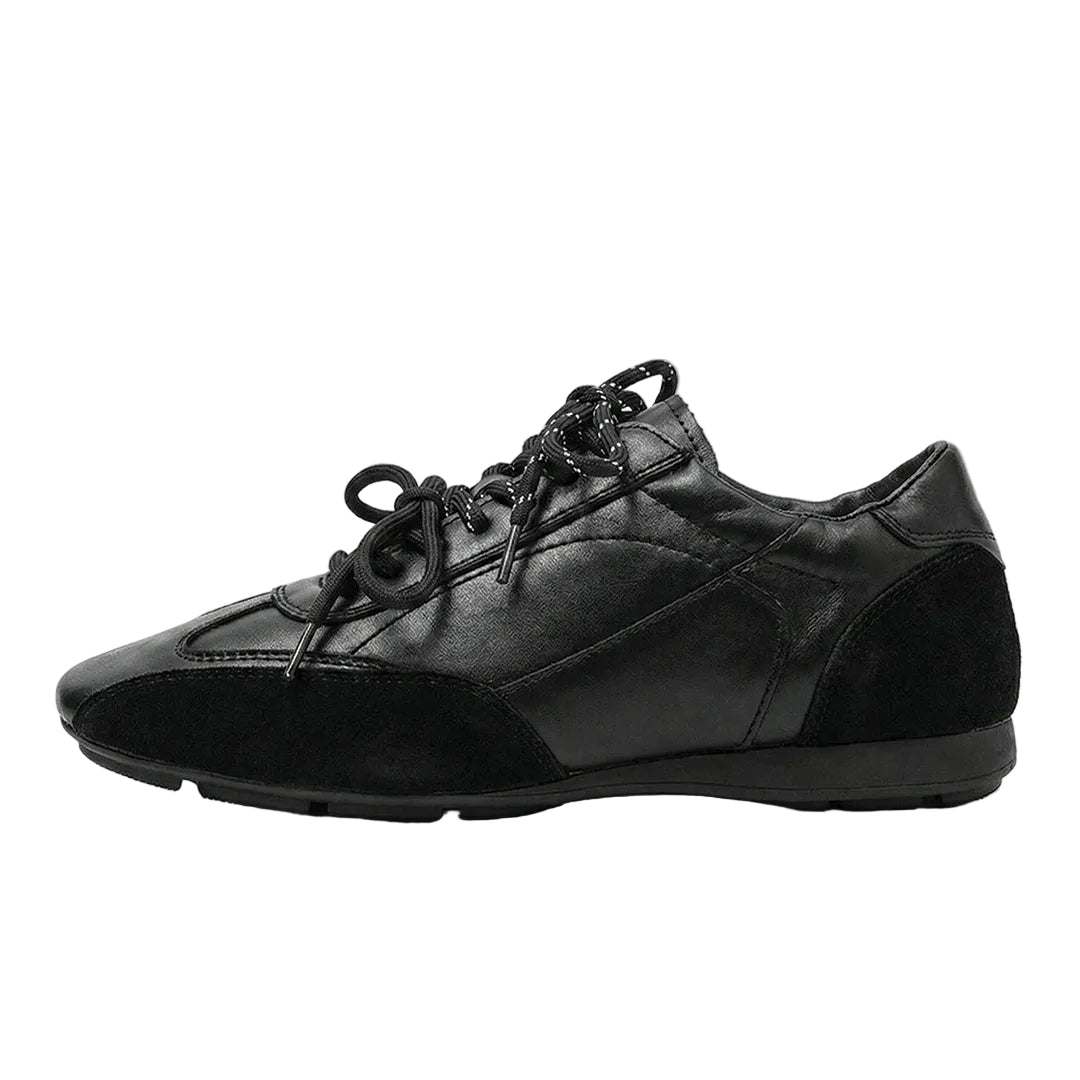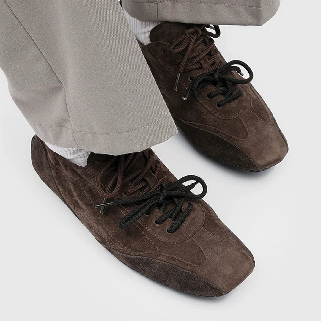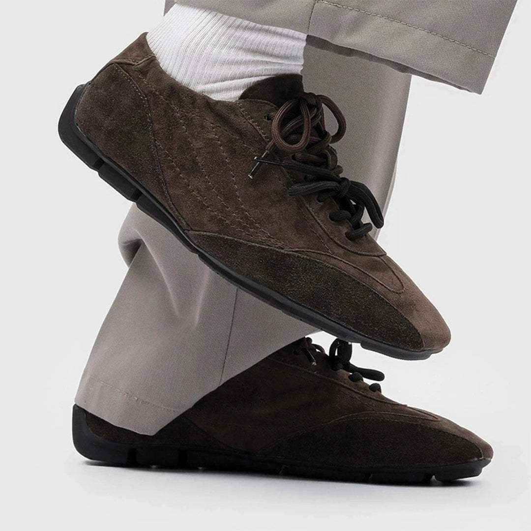 A double-lace detail brings a graphic element to this streamlined suede and leather sneaker. Designed with a soft, collapsible back, it transitions effortlessly between a closed shoe and an open slide.