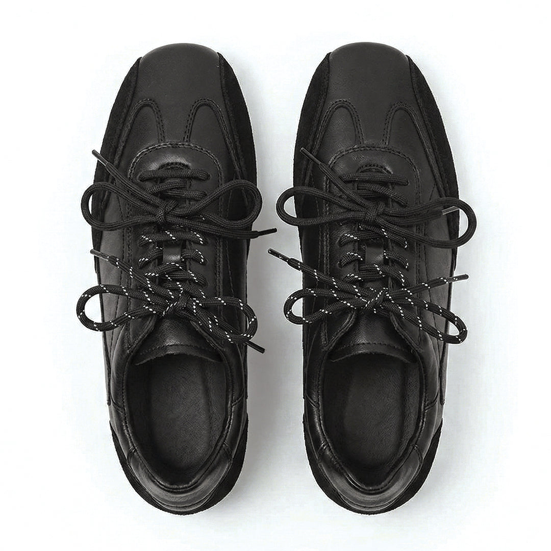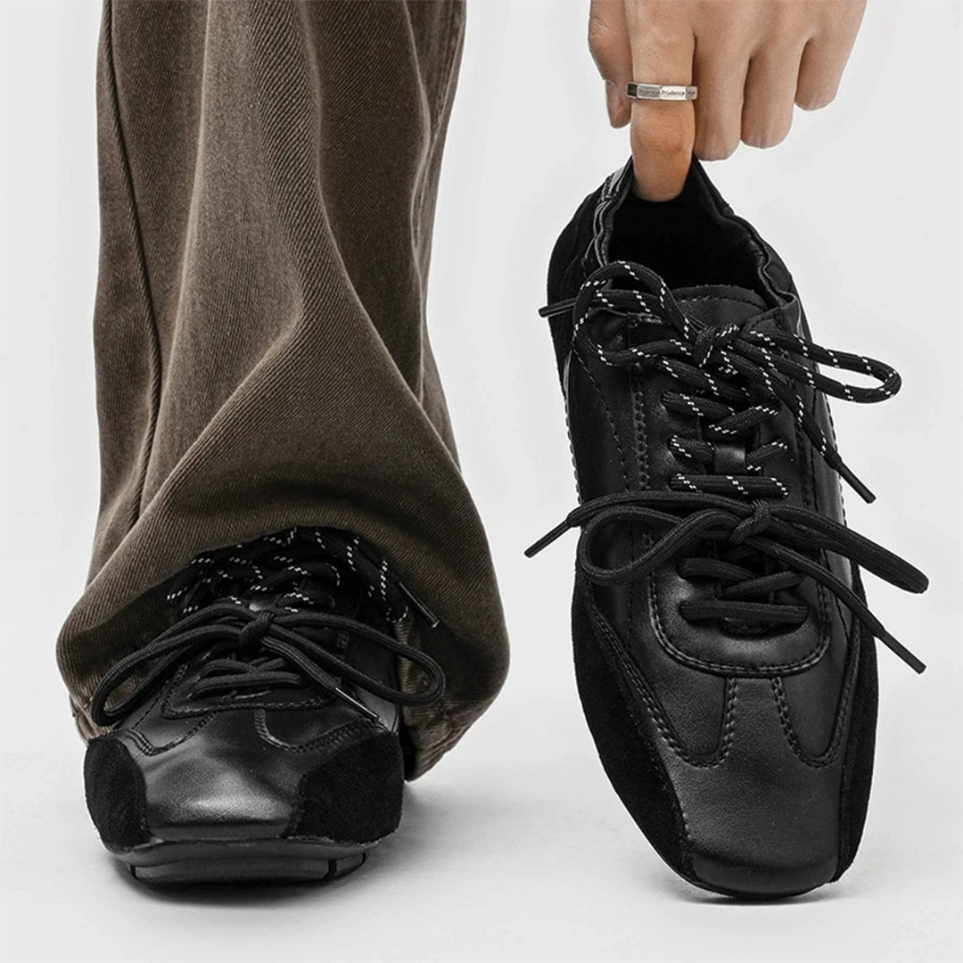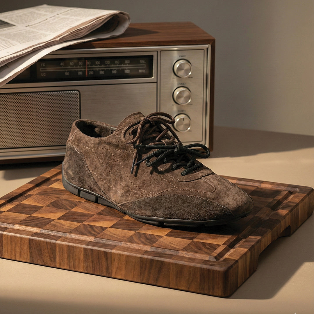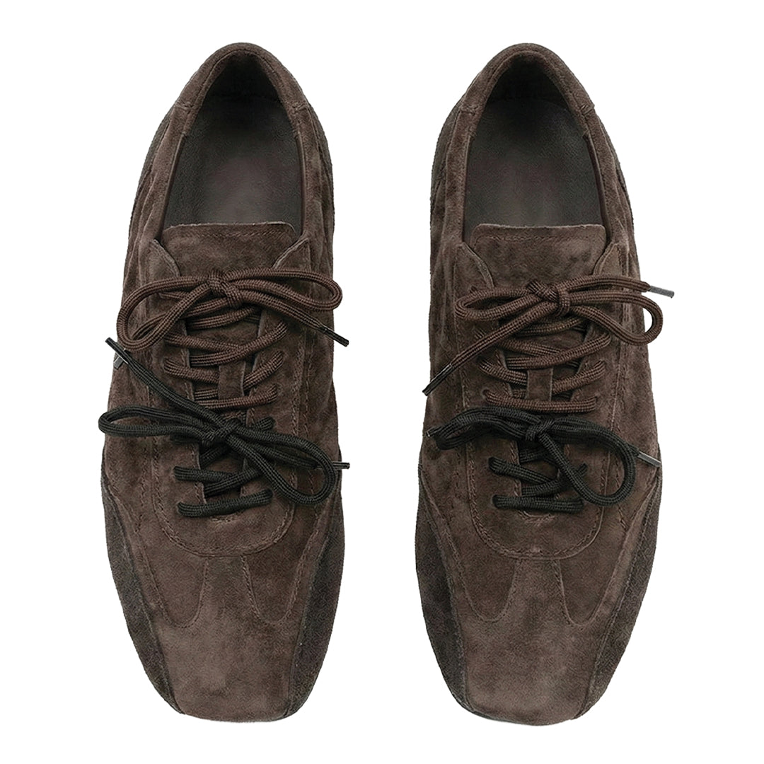 A double-lace detail brings a graphic element to this streamlined suede and leather sneaker. Designed with a soft, collapsible back, it transitions effortlessly between a closed shoe and an open slide.