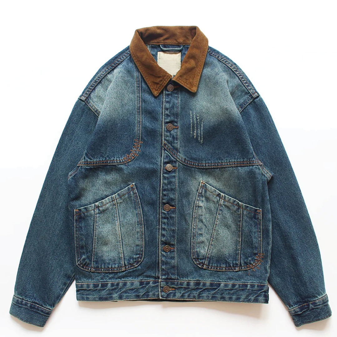 Crafted from robust denim with a soft corduroy collar, this jacket offers a refined take on a classic. The intentional aging process adds depth to the material, creating a unique appeal.