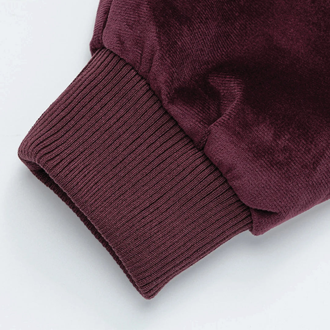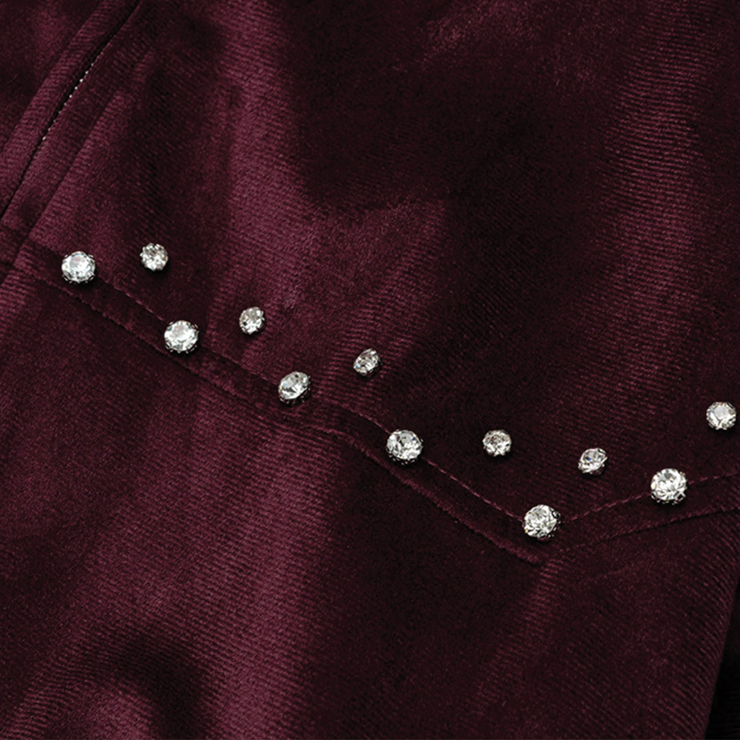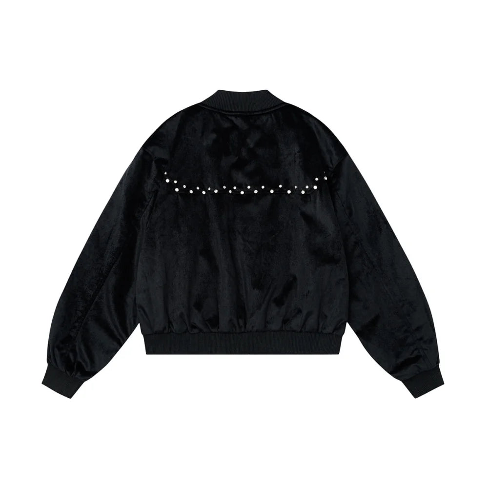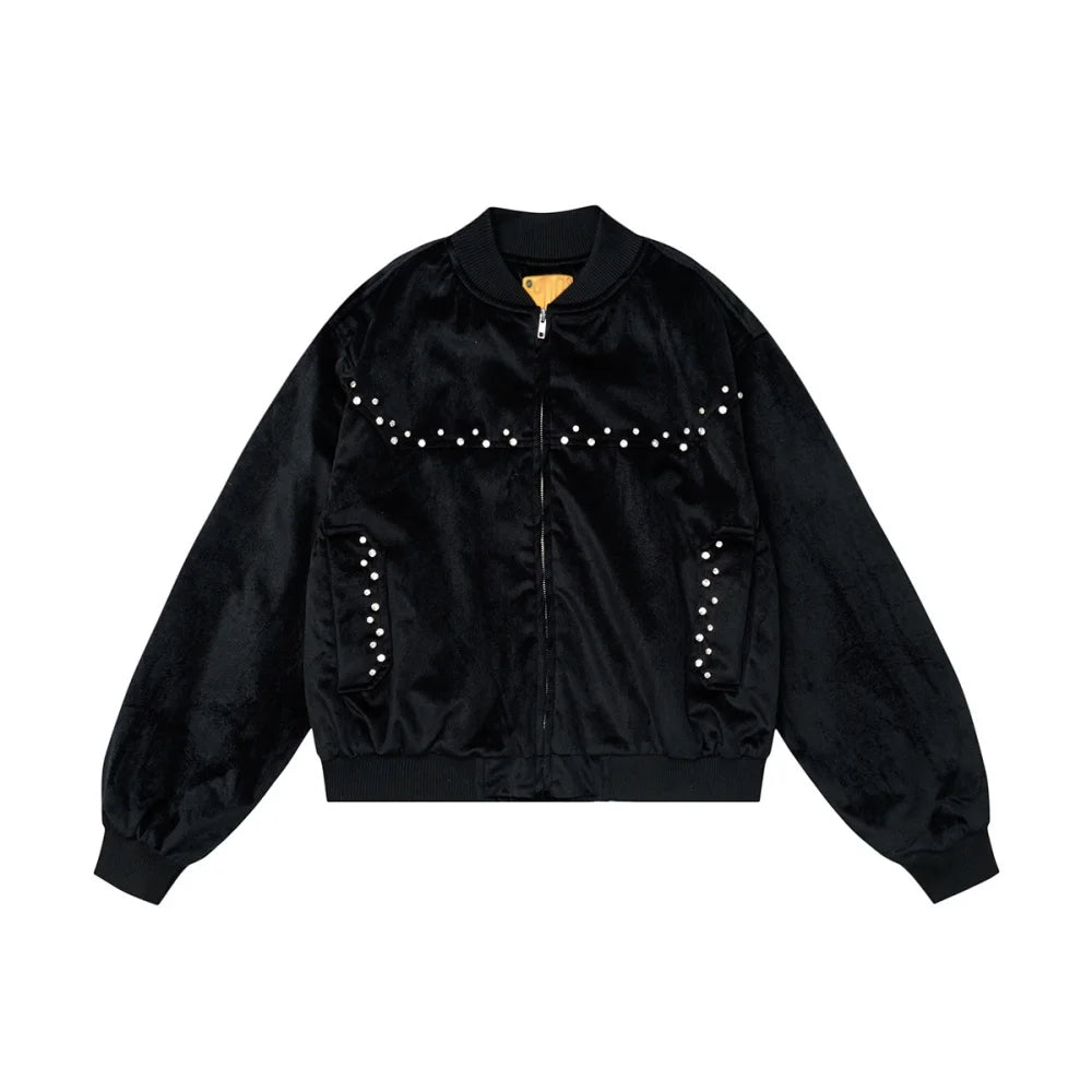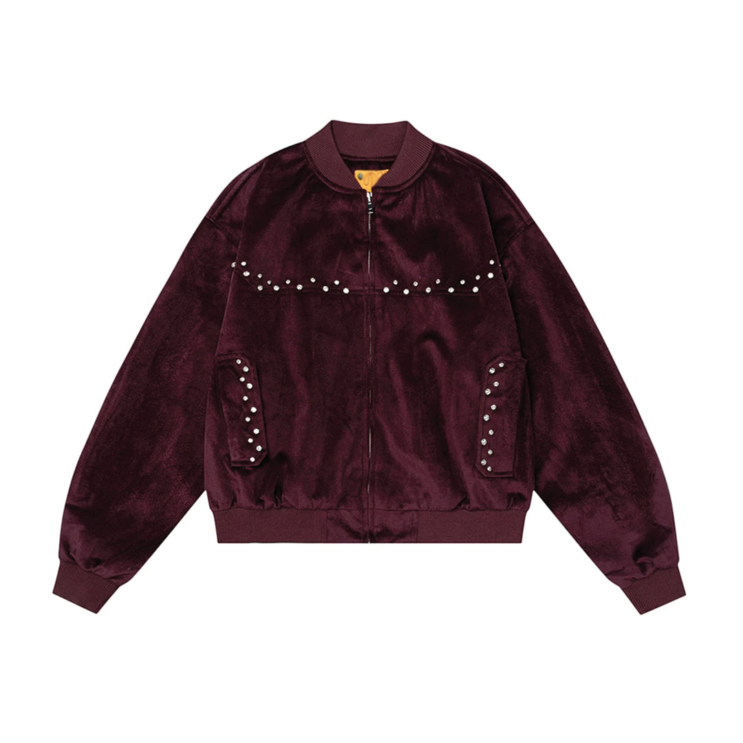 Velvet is offset here with studded detailing that runs across the chest and down the pockets. The ribbed cuffs and hem ensure it sits neatly over denim or tailored trousers.