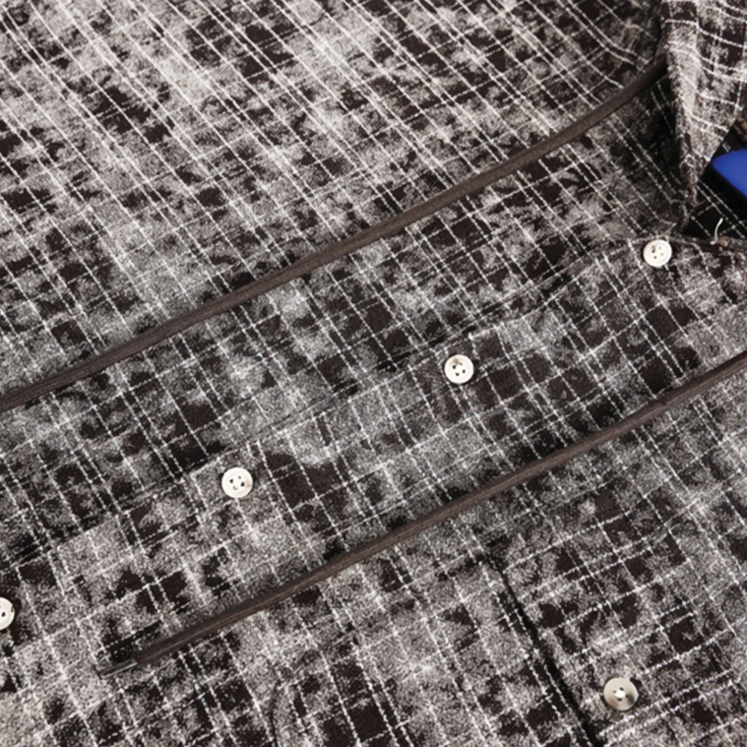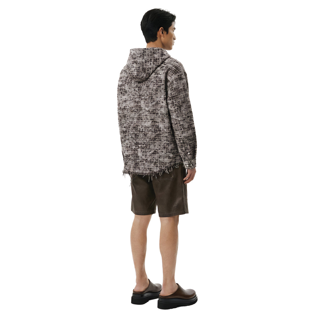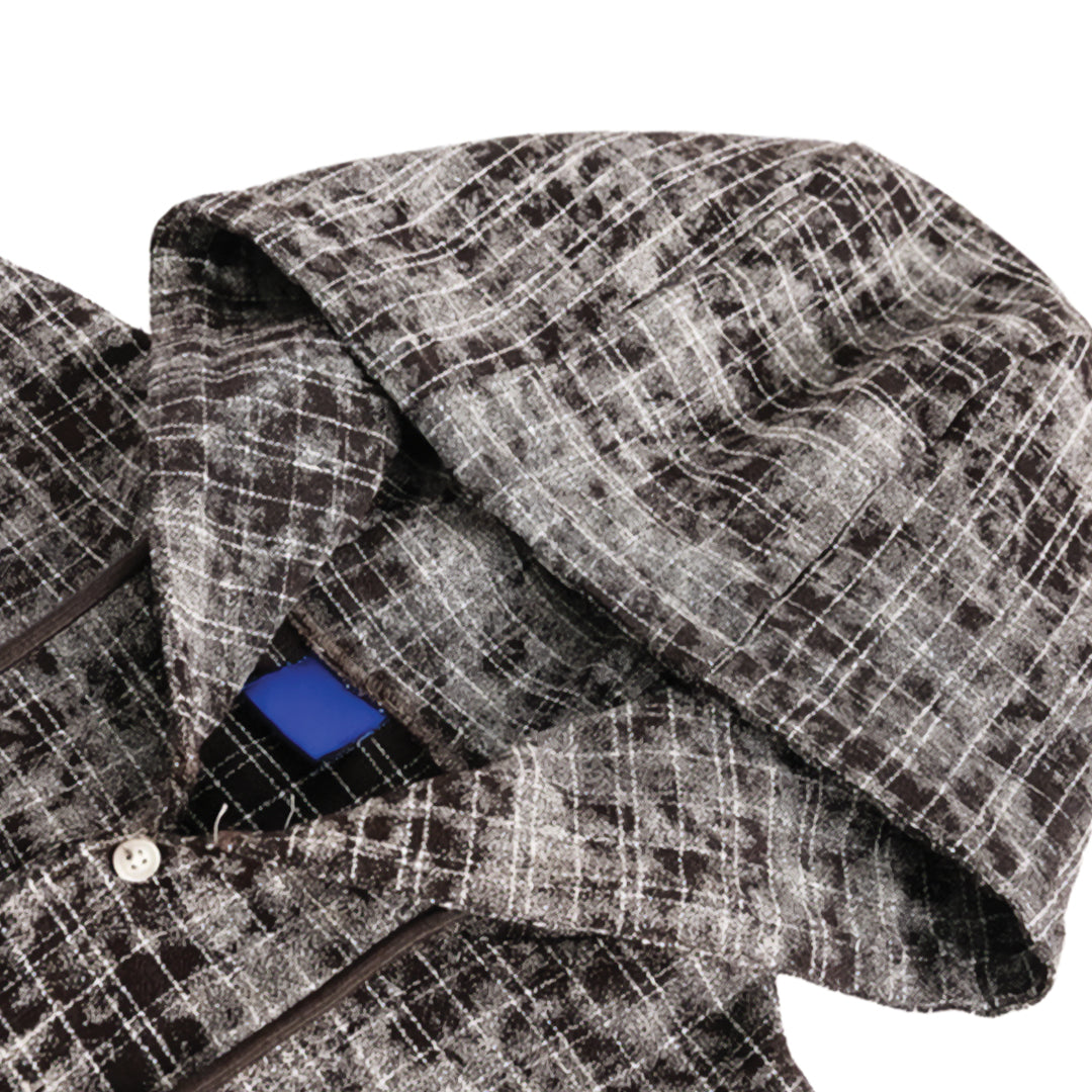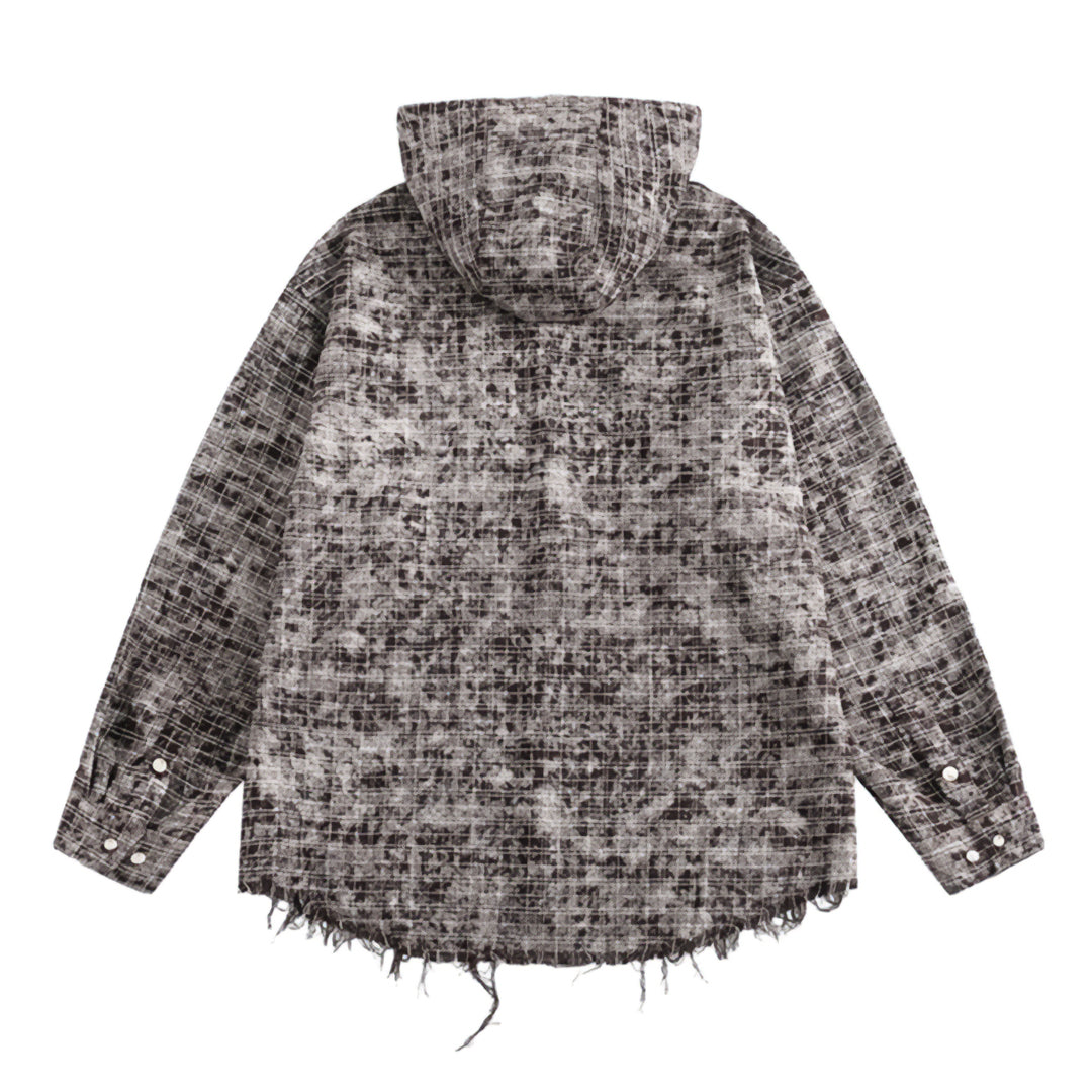A hooded shirt with a broken-plaid texture that feels lived-in from day one. Raw hem detail gives it a quiet sense of motion.