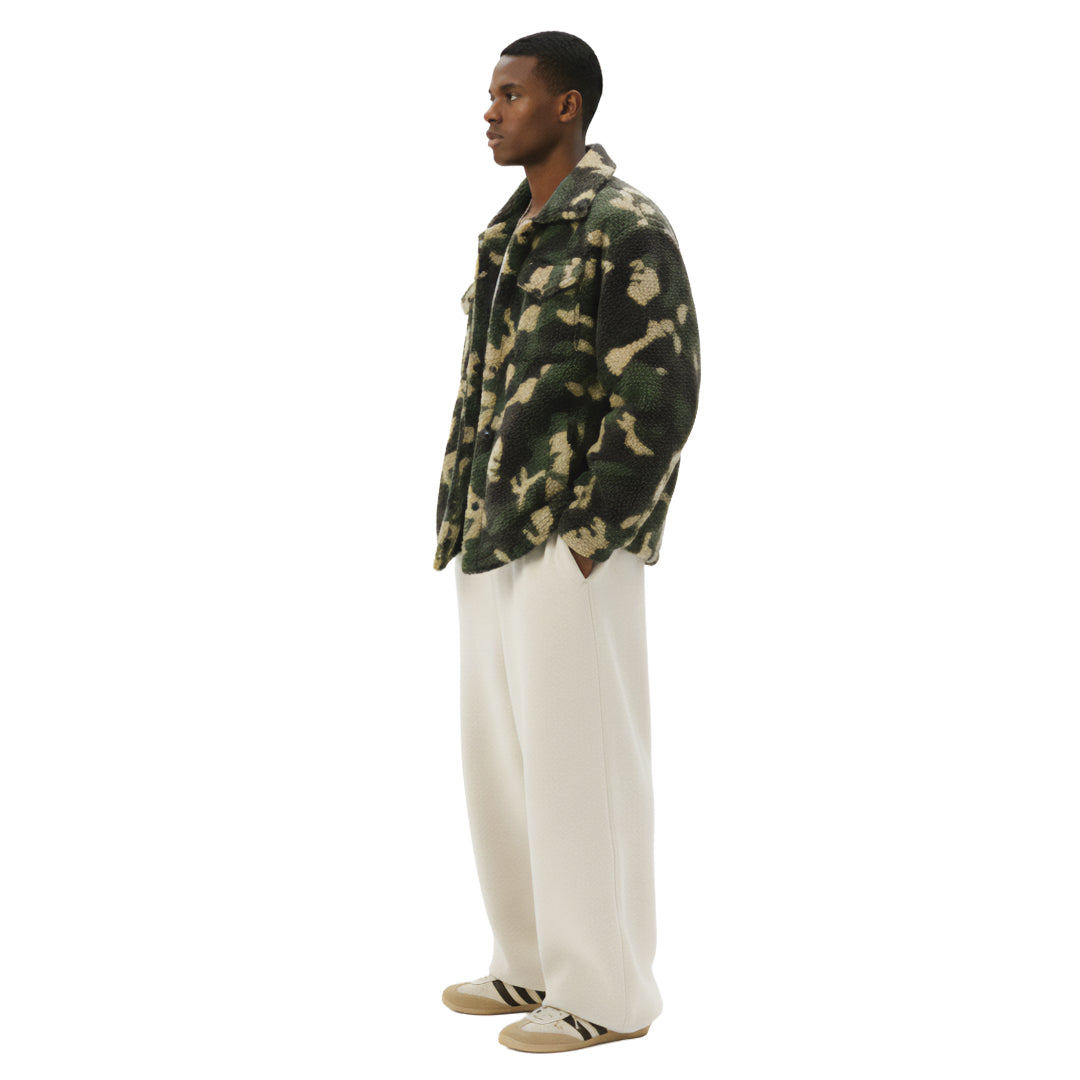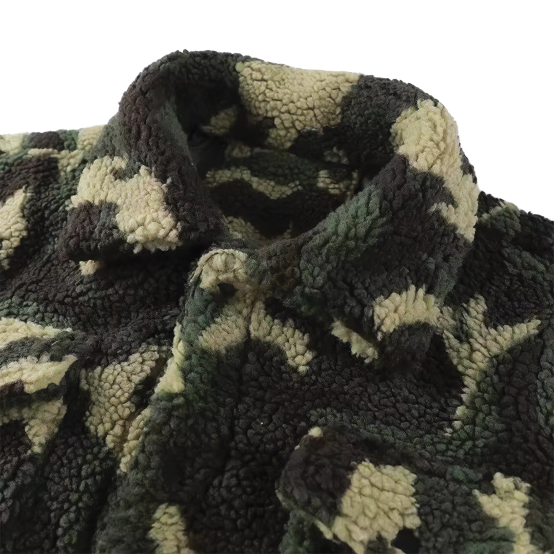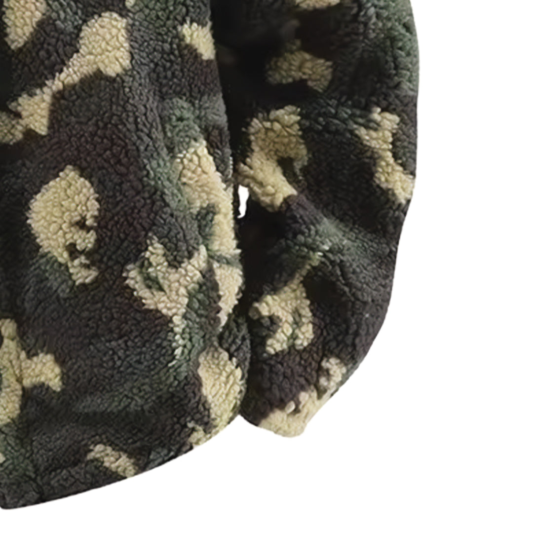 This jacket is made from plush fleece with a muted camouflage print throughout. The shape is easy and refined, offering warmth without bulk.