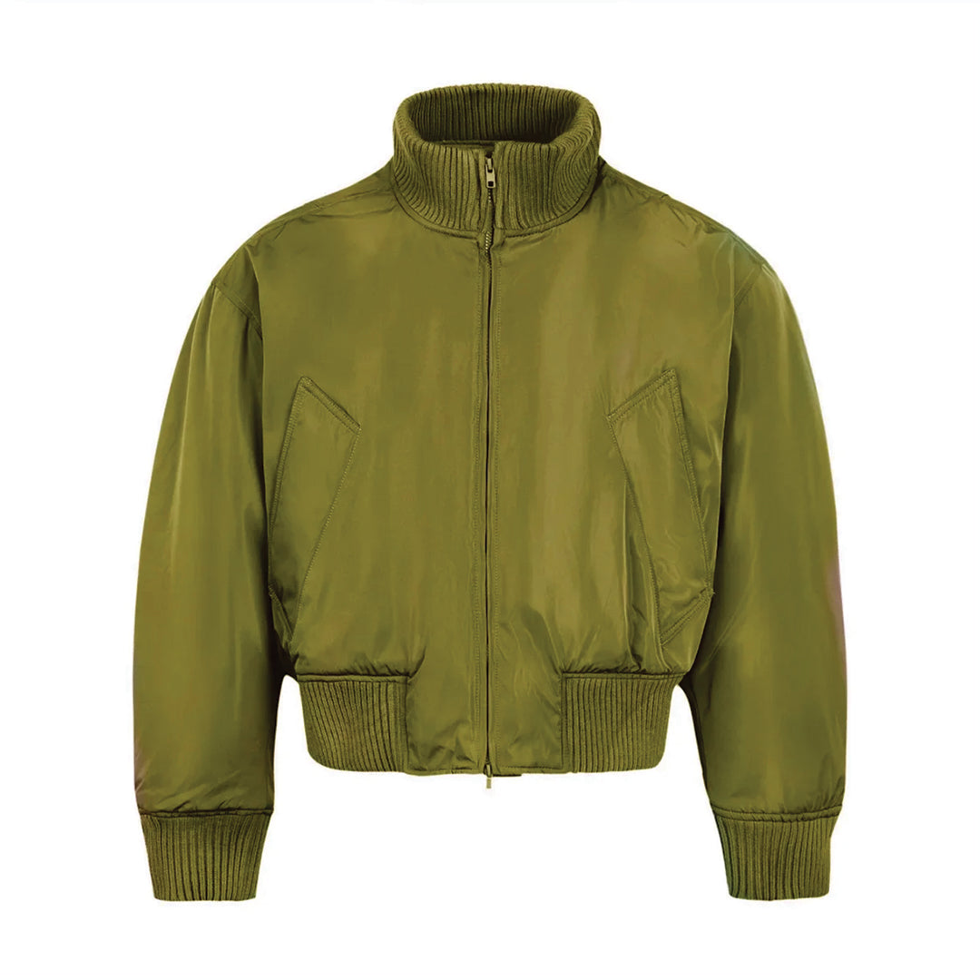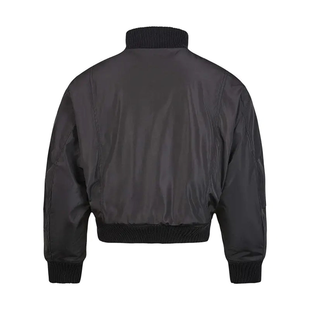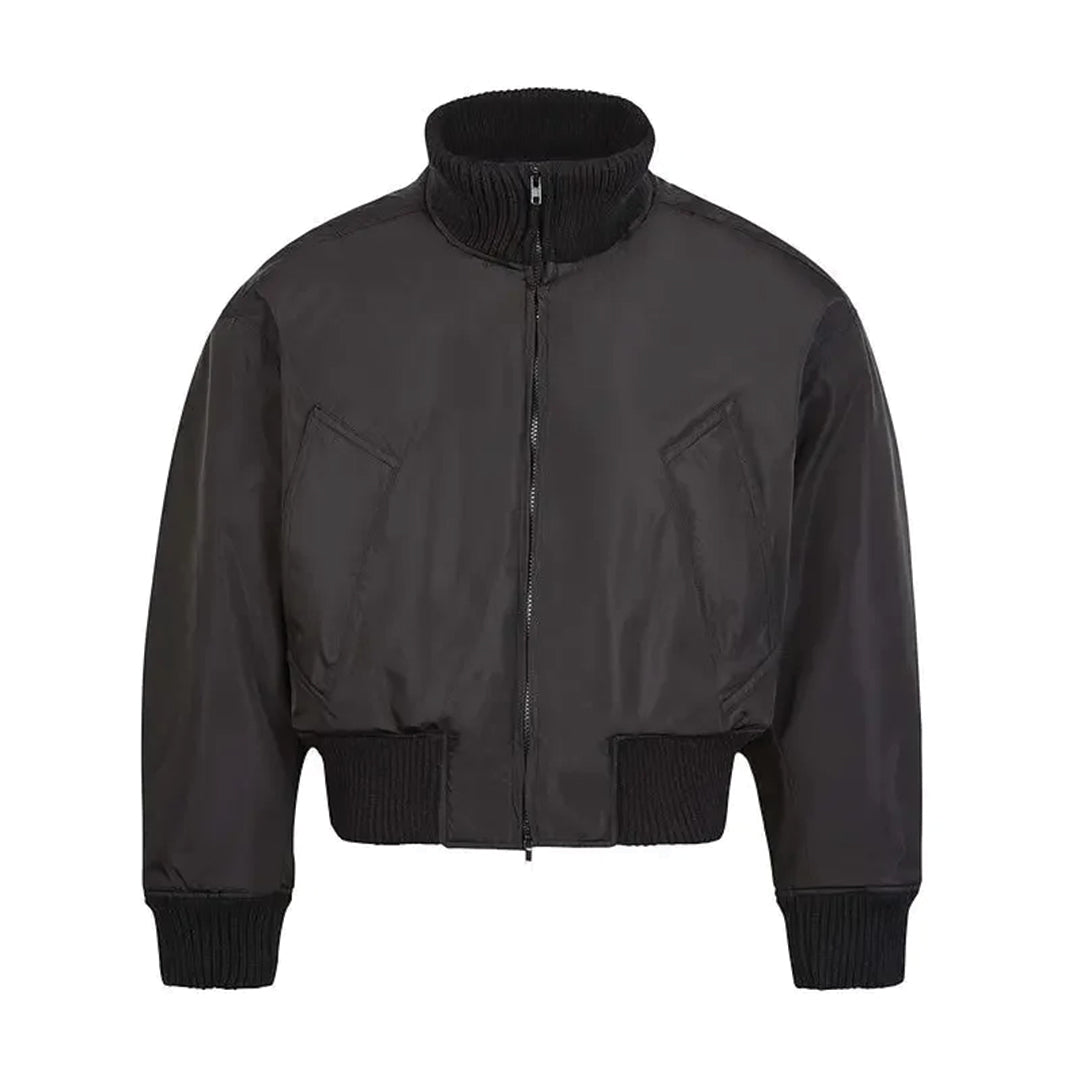 The cropped bomber jacket offers a clean silhouette finished with ribbed cuffs and collar. Its minimal structure allows it to be styled across seasons with ease.