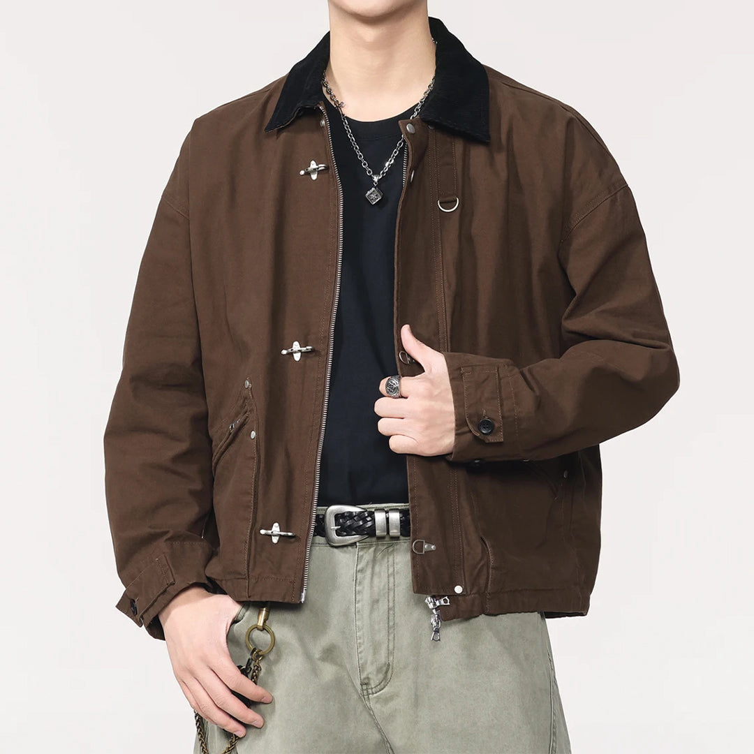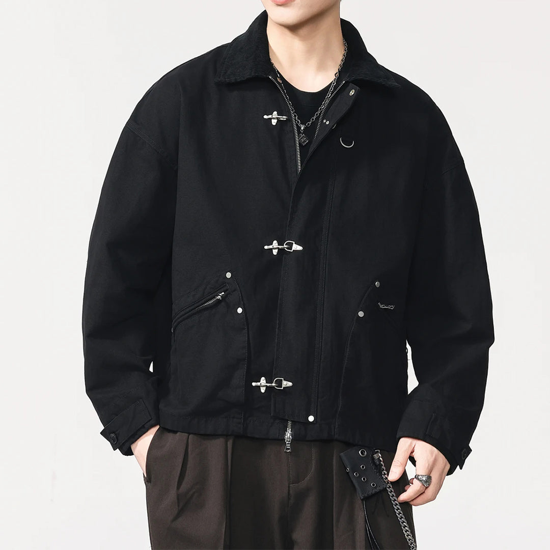 This jacket refines utilitarian detailing with polished silver closures and a sharp collar. Its tailored cut underscores the brand’s focus on modern wardrobe staples.
