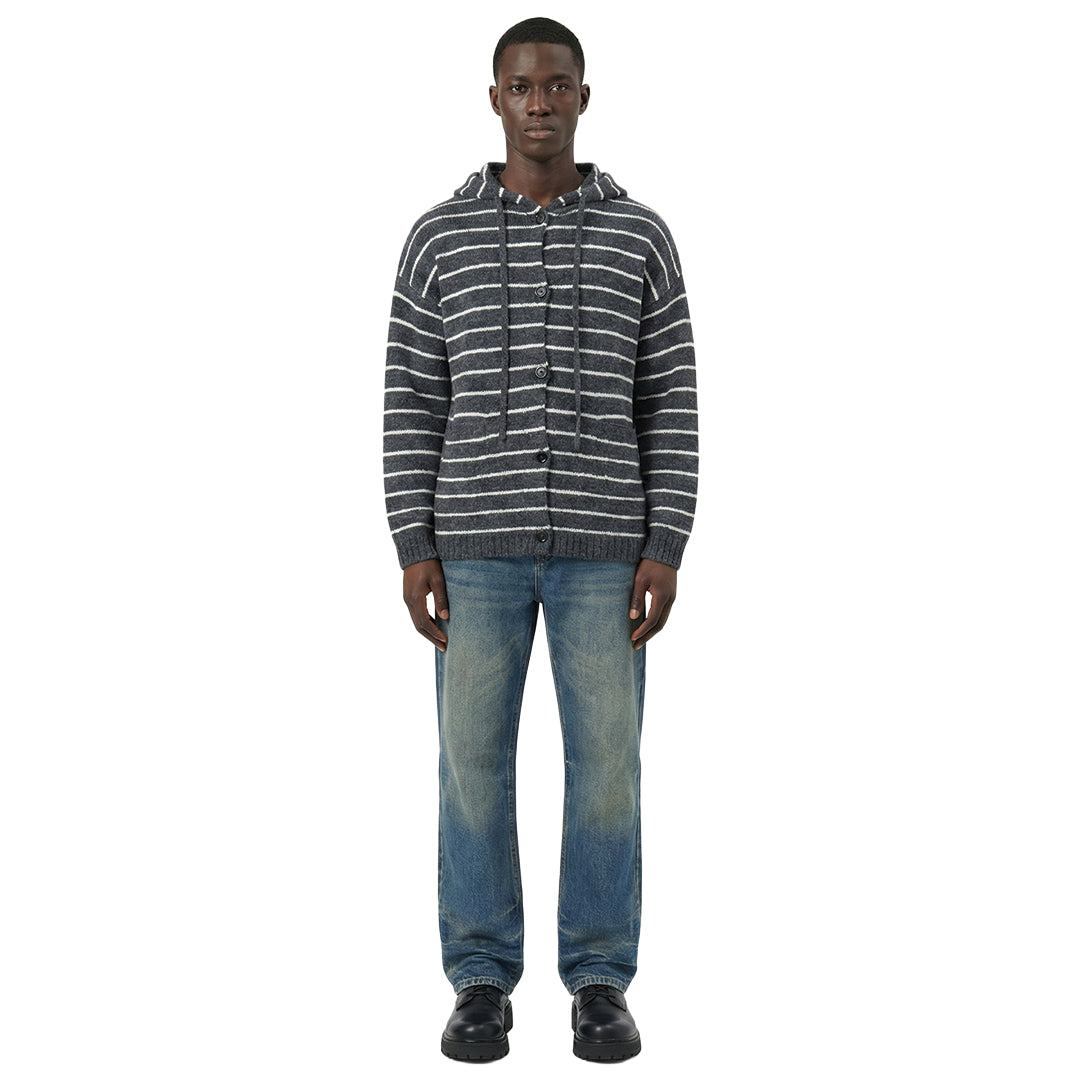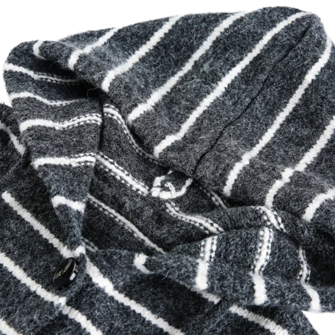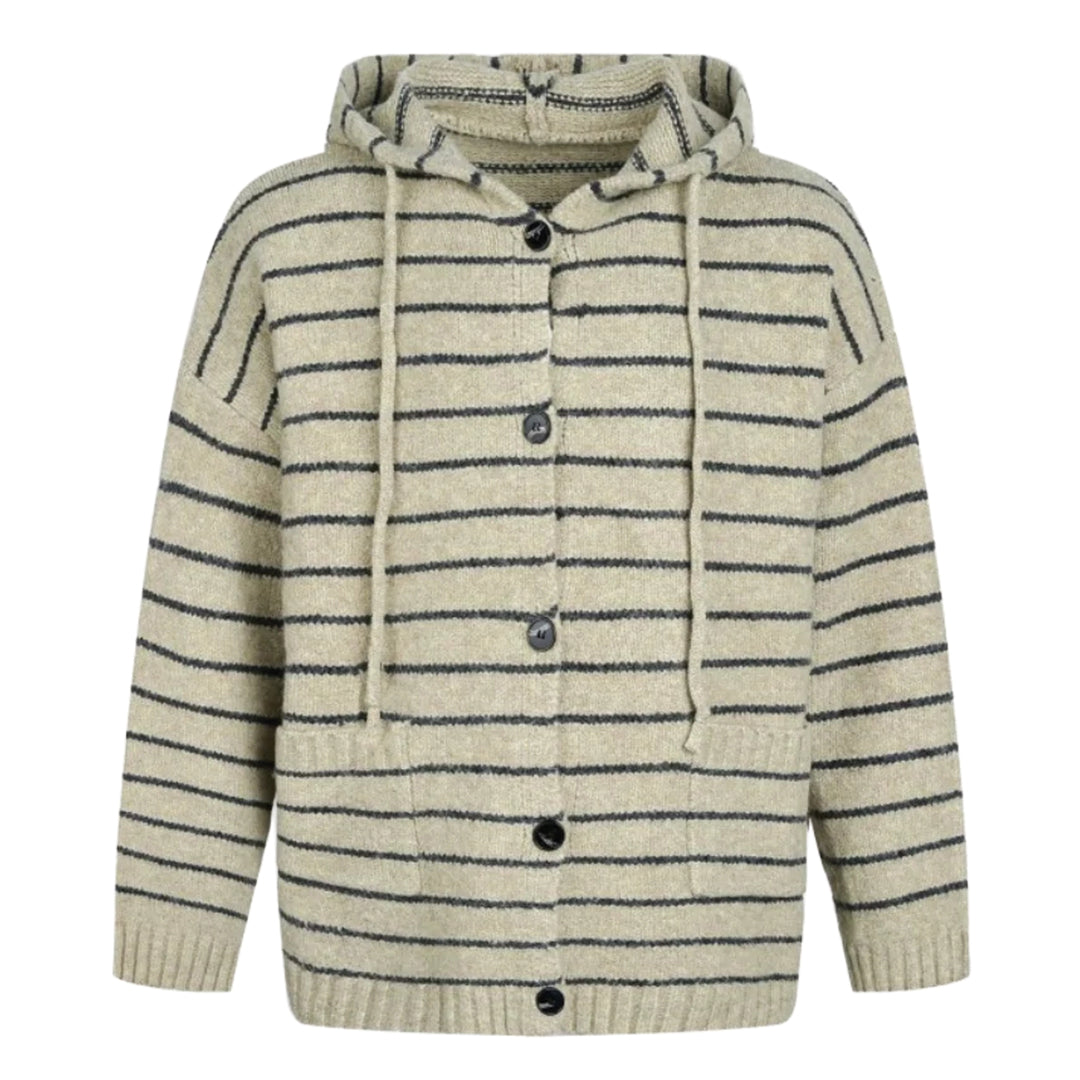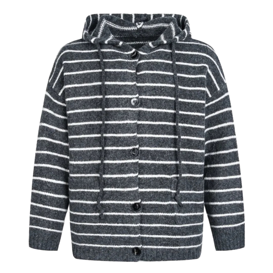 This hooded cardigan features a soft knit texture and bold horizontal stripes for a clear visual statement. The dropped shoulders and open button front allow for effortless layering over a simple tee.