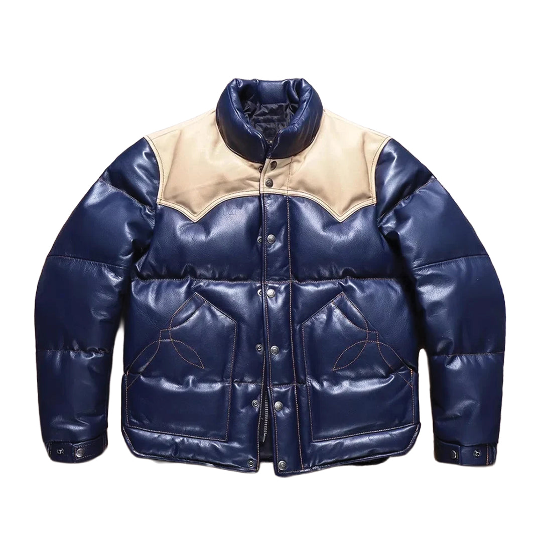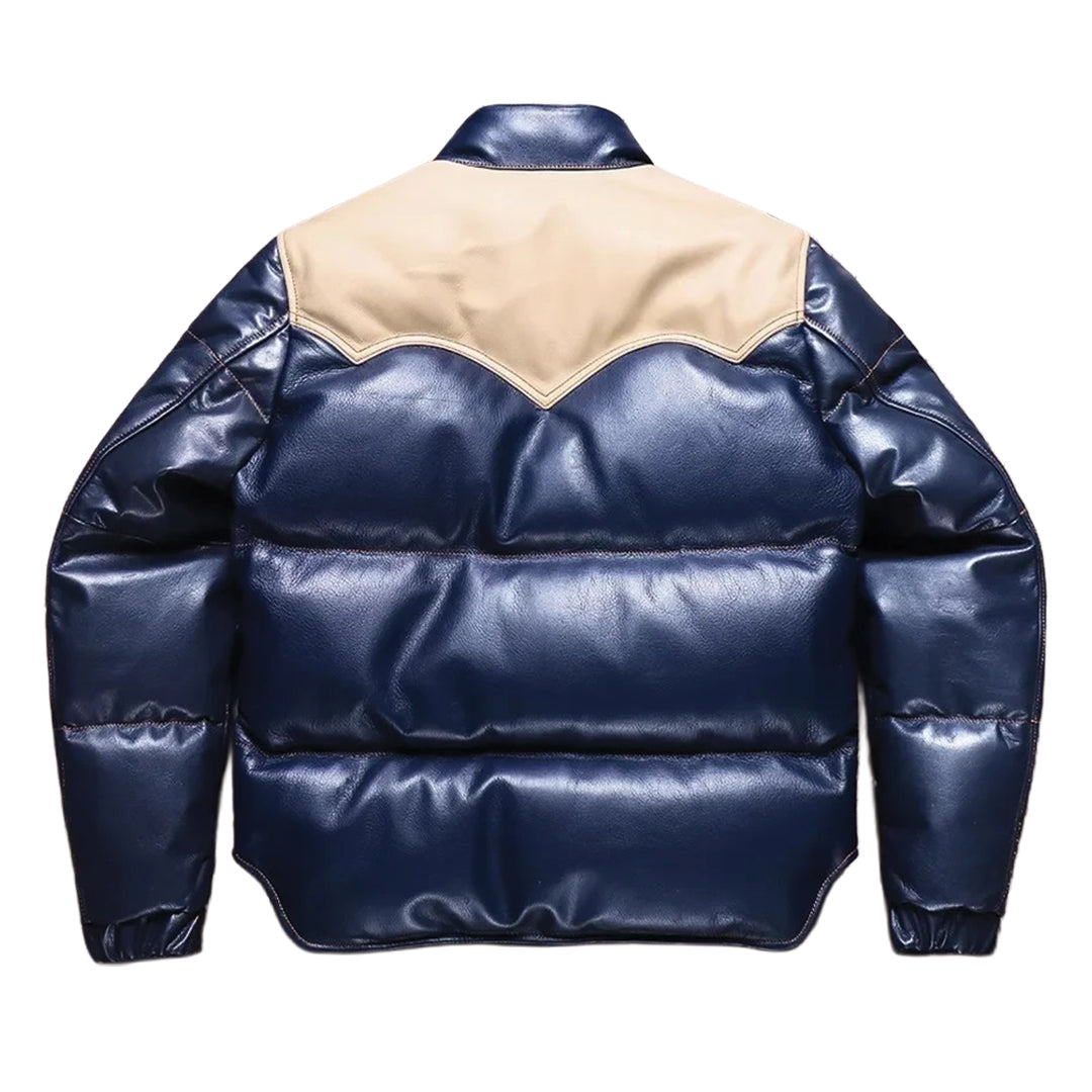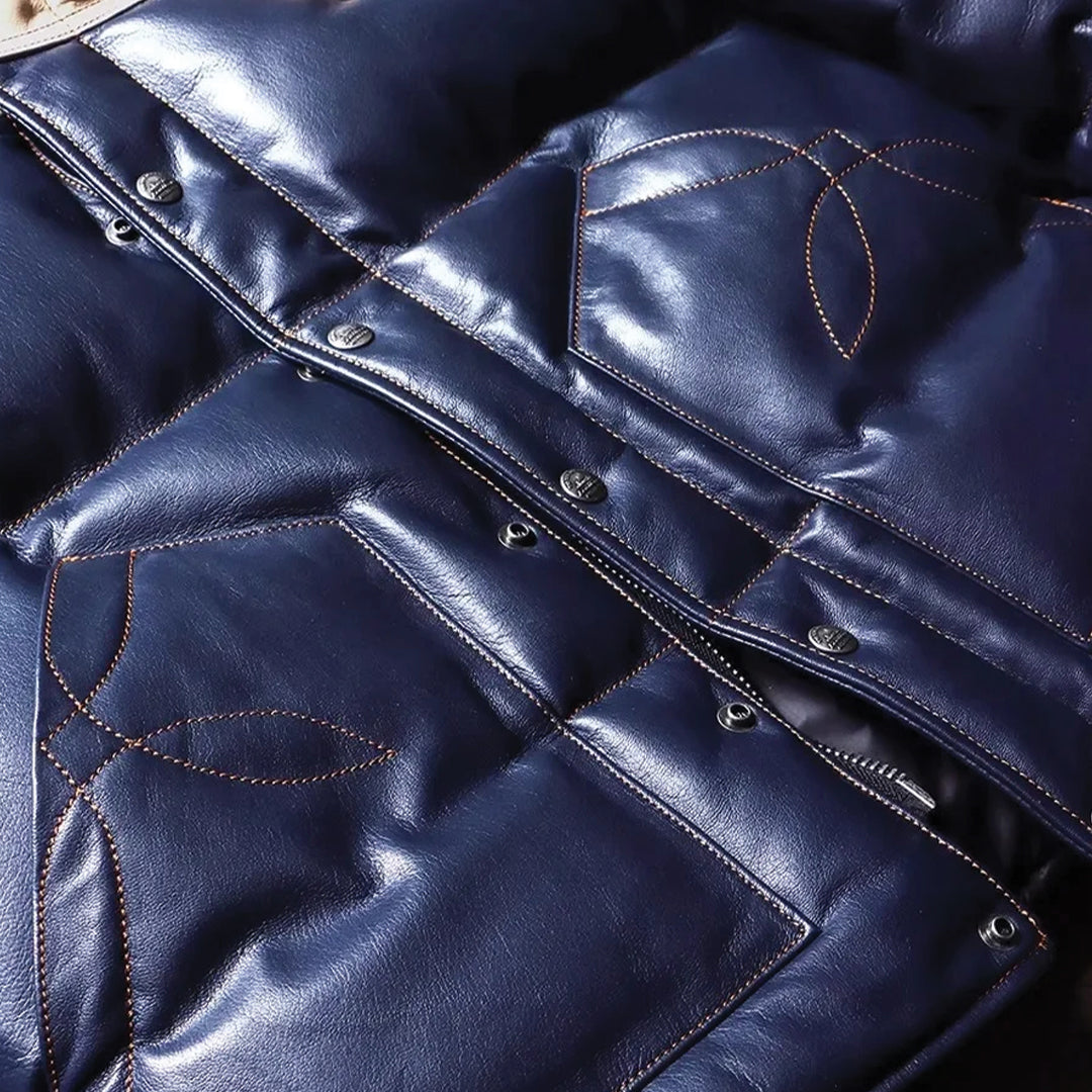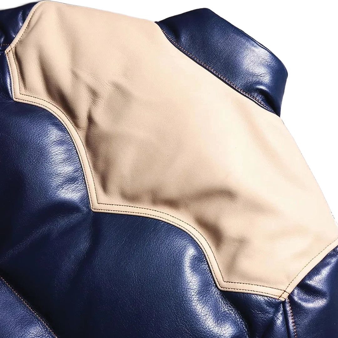 A puffer with a clean western-style yoke and deep navy goatskin brings a sharper take on cold-weather layers. It holds shape with a structured body and sits comfortably over denim or cargos.