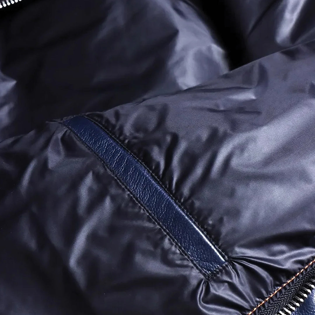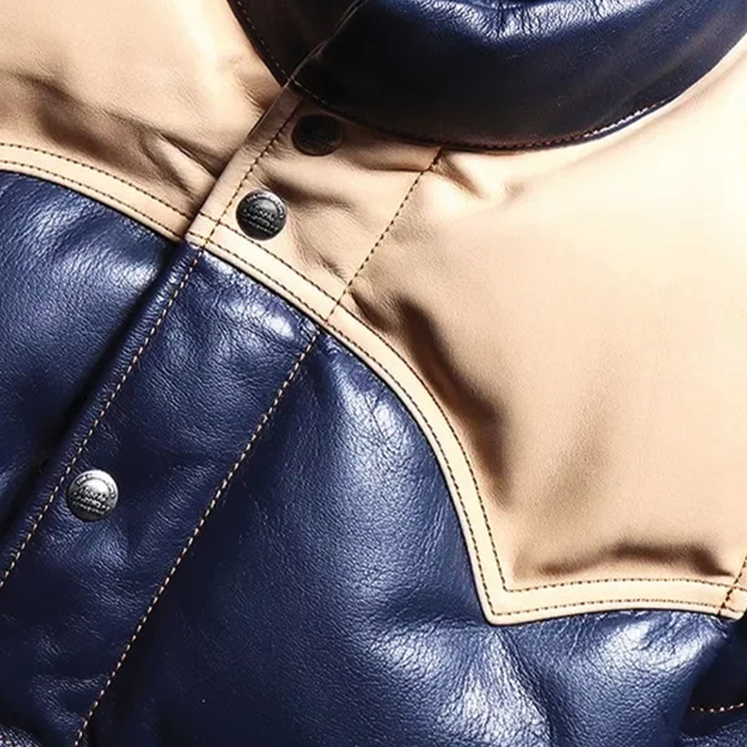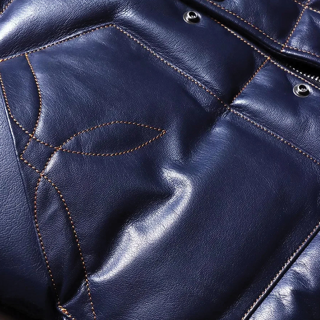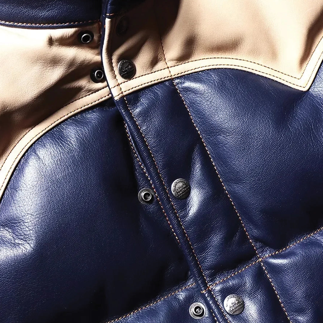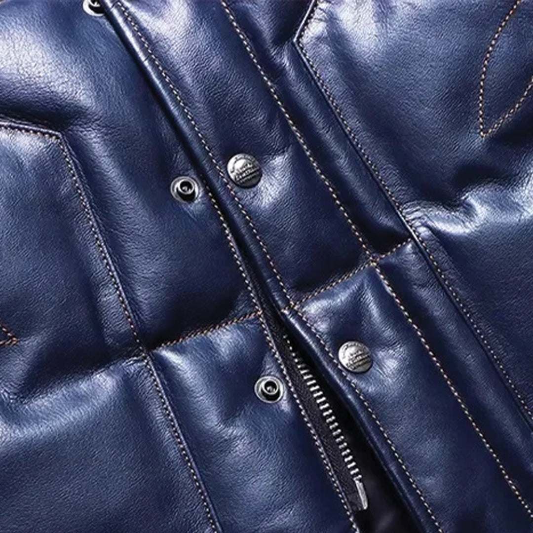 A puffer with a clean western-style yoke and deep navy goatskin brings a sharper take on cold-weather layers. It holds shape with a structured body and sits comfortably over denim or cargos.