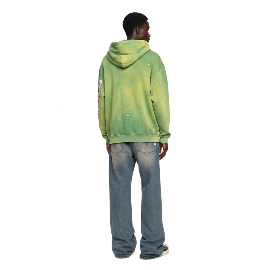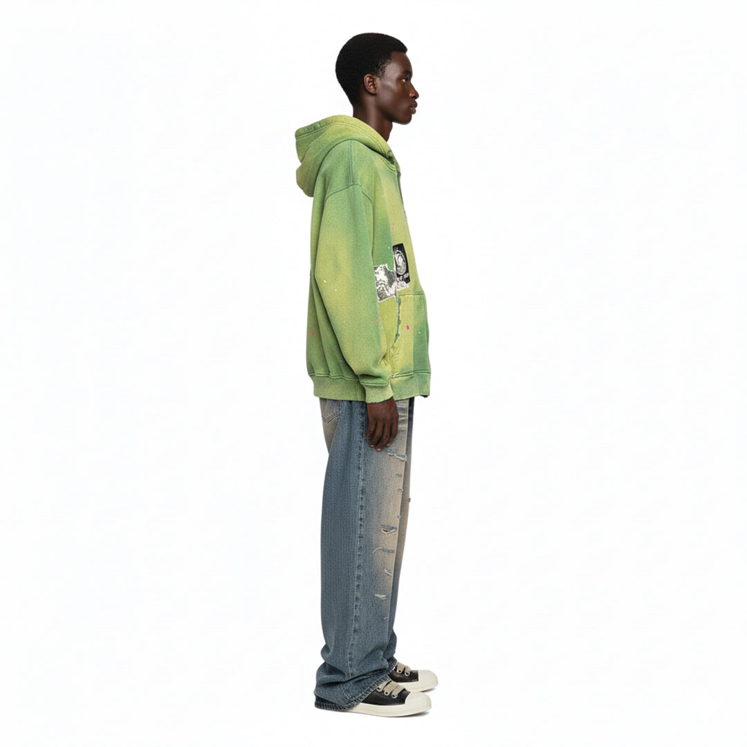 This cotton zip hoodie is dyed in tonal greens and lightly distressed for natural texture. Printed punk patches add contrast with a graphic punch.